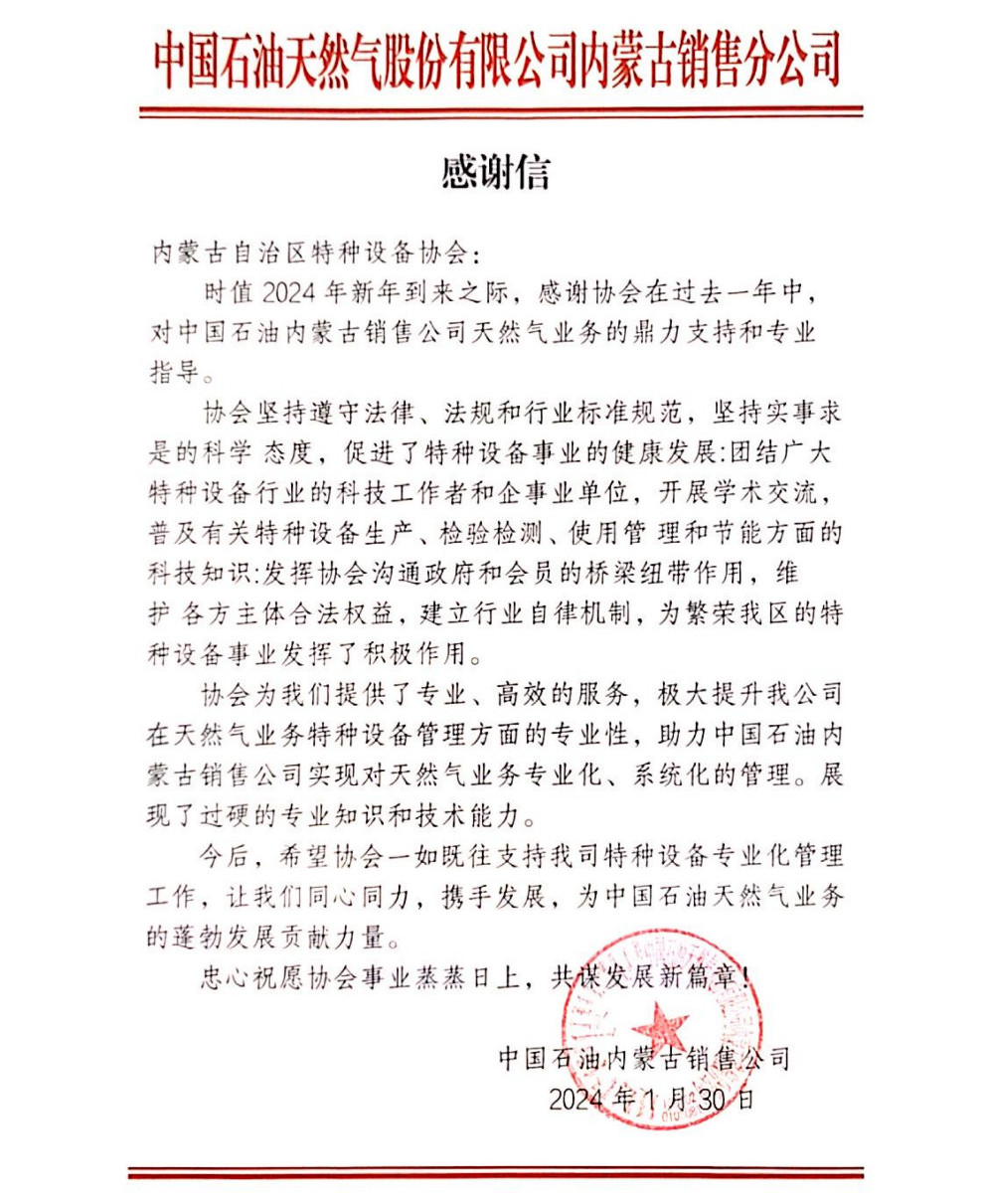 近期,內(nèi)蒙古自治區(qū)特種設(shè)備協(xié)會收到來自中國石油天然氣股份有限公司內(nèi)蒙古銷售分公司的感謝信,信中對協(xié)會對中國石油內(nèi)蒙古銷售公司天然氣業(yè)務(wù)的鼎力支持和專業(yè)指導(dǎo)表示衷心的感謝。信中對協(xié)會嚴(yán)格遵守法律法規(guī)和行業(yè)標(biāo)準(zhǔn),秉持科學(xué)態(tài)度,積極推動了特種設(shè)備行業(yè)的健康發(fā)展做出了高度的肯定,同時贊揚協(xié)會團結(jié)了特種設(shè)備行業(yè)的廣大科技工作者和企事業(yè)單位,通過學(xué)術(shù)交流、科技知識普及等方式,為行業(yè)的進步做出了積極貢獻。