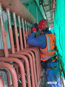 內蒙古長城發電有限公司上海廟煤電1000MW項目施工主體#1機組建筑(設)安裝工程金屬檢測工程施工現場,主蒸汽管道材質為A335P92,規格為ID349×100,進行了超聲波檢測、磁粉檢測、硬度檢測和金相檢驗。